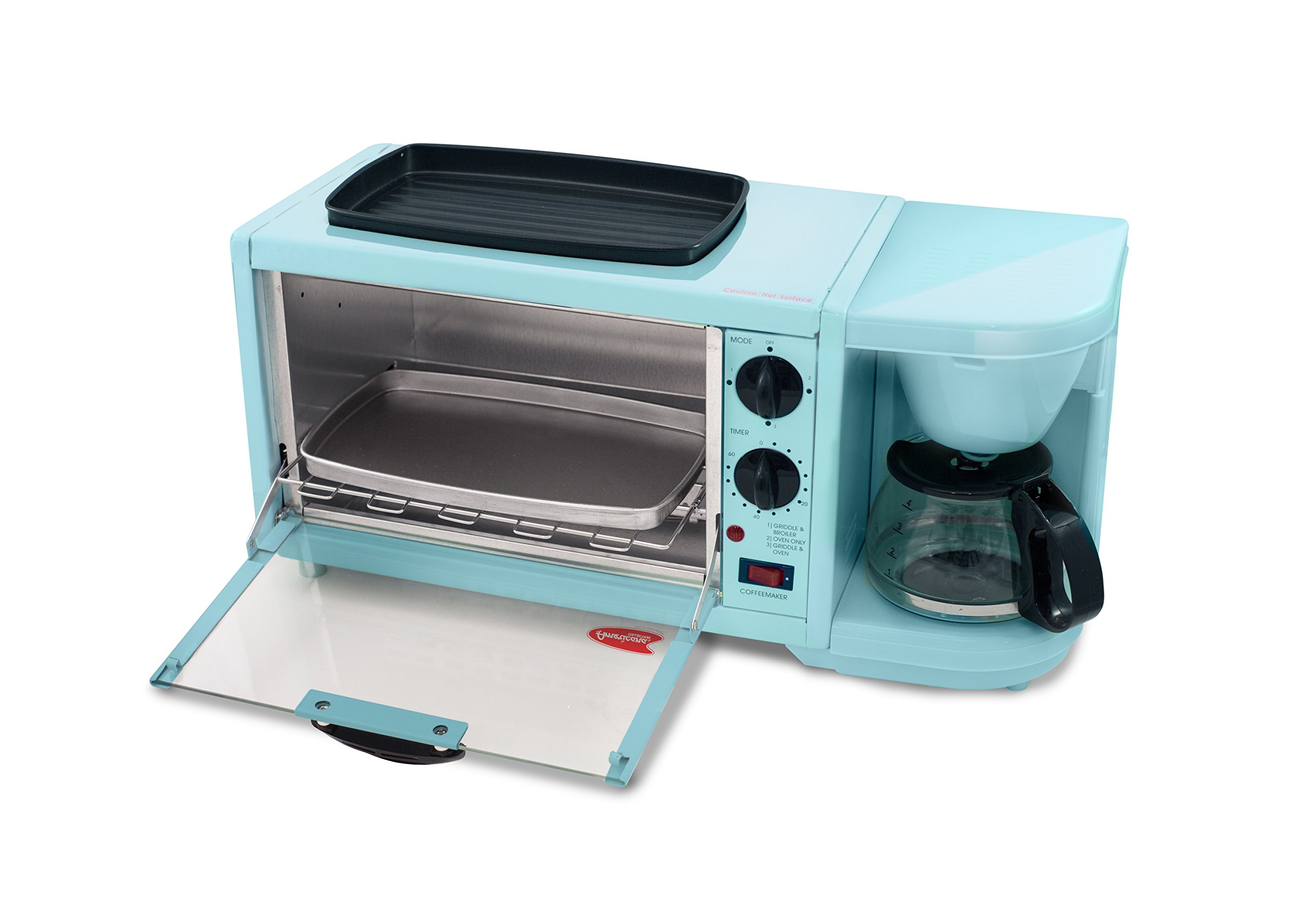 Breakfast Station - Toaster Oven, Griddle Coffee Maker ... from i5.walmartimages.com This retro coffee maker toaster oven combo comes in blue color and is ideal for countertops. Brew a fresh cup of coffee, toast a croissant and fry up an egg or steam vegetables all at once. Toaster oven fits up to 4 slices. 4 cup capacity coffee maker. The compact design lets you store this appliance when not in use. This toaster oven coffee maker combo is perfect for making a quick meal for one. You can also use tea bags to make yourself a favorite cup of tea. User rating, 4.9 out of 5 stars with 14 reviews.