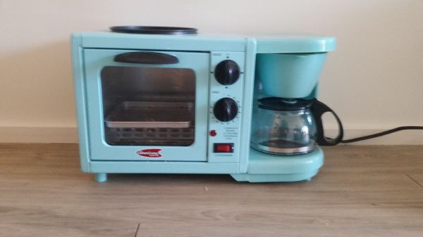 The dimensions of the breakfast station are 19.2 inches by 11.8 inches by 11.5 inches. Toaster oven coffee maker combo. Specialty appliance incorporates toaster oven, coffee maker, frying pan and steam tray. Shop for hhgregg retro toaster oven coffee maker at best buy. The door of the oven and body is heat resistant. Bakes & grills this model of a 2 in 1 toaster oven comes in red color and is perfect for preparing all the breakfast food by using just one appliance. This retro coffee maker toaster oven combo comes in blue color and is ideal for countertops. Elite coffee pot griddle toaster oven. It is made of premium quality stainless steel material that is painted with matte black color. It features a toaster oven with a griddle on top, as well as a coffee making station on the side. It's ideal for offices, campers, and college dorms. I'm thinking about sanding down the wood and change the color but that will be a future project. Ideal for dorm rooms, hotel rooms or guest rooms.